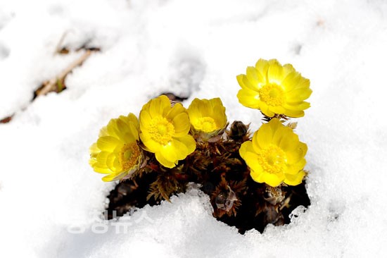 봄을 알리는 전령사인 설연화(일명 복수초)가 100여 촉이 군락을 이루며 보문산 자락에서 눈을 뚫고 피어나 아름다운 자태를 뽐내고 있다.
