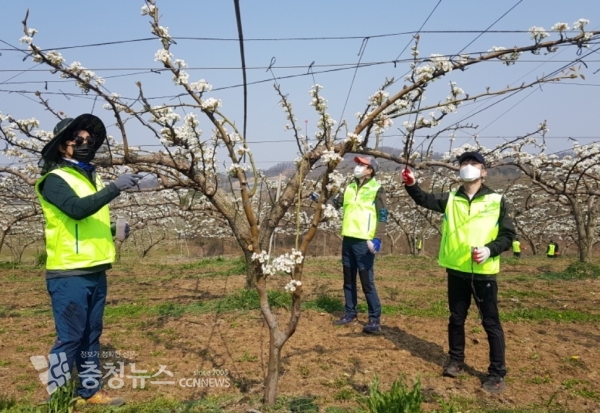 이에 충남농협 길정섭 본부장과 류병관 농협노조 충남세종지역위원장 은 배 과수농가의 부족 일손을 집중 지원하기 위해 임직원 100여명과 함께 천안시 직산농협(조합장 민병억)과 성환농협(조합장 차상락) 관내 20여 과수농가에서 배 꽃 인공수분을 도왔으며, 작업 중 마스크 착용, 2m 건강거리 유지 등 정부의 사회적 거리두기 지침을 철저히 준수하며 영농지원에 나섰다.