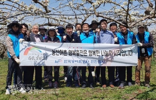 한국농어촌공사 천안지사(지사장 오기석)와 천안시기자협회(공동간사 정덕진, 주영욱) 합동으로 13일 성홥읍 소재 과수농가에서 일손돕기 사회공헌활동을 전개했다.
