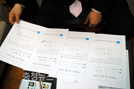 ▲ 대전 서구청장 경선 합의문 서명한 것을 학인하고 있다