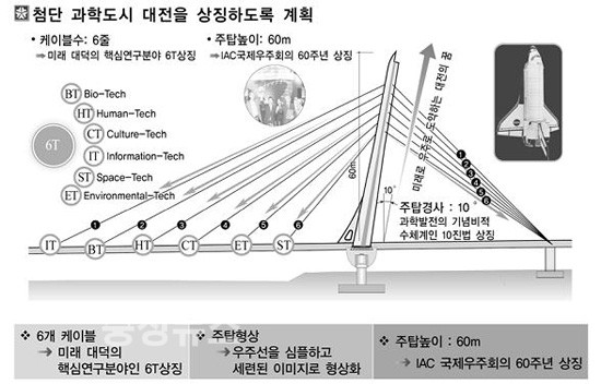 또한, 주탑과 교량을 연결하는 6줄의 케이블은 미래 대덕의 핵심 연구분야 6T(Bio Tech, Human Tech, Culture Tech, Information Tech, Space Tech, Environmental Tech)를 상징하고, 교량의 3방향은 과학과 꿈과 빛을 상징하며 “꿈이 있는 빛의 교량”, “꿈이 있는 빛의 정원”, 꿈이 있는 빛의 축제“가 어우러져 대전의 다이내믹한 꿈을 표현한 빛 연출 축제와 유희의 공간을 나타내고 있다.