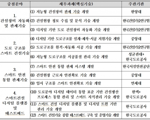 한편, 한국도로공사는 스마트 건설기술 개발사업의 총괄기관 역할 외에도 4개 세부과제의 연구기관으로 참여한다.