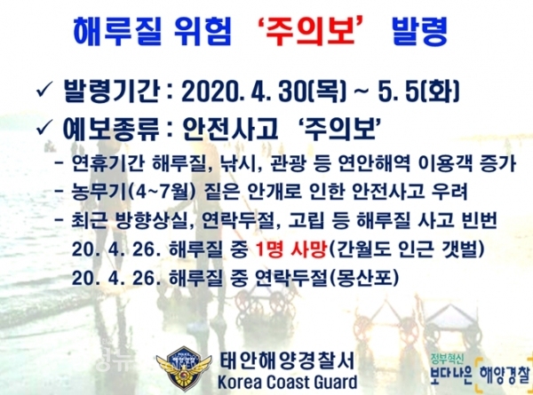 태안해양경찰서는 4월 30일부터 5월 5일까지 6일간 연안해역 안전사고 위험 “주의보”를 발령해 바닷가 안전에 각별한 주의를 당부하고 나섰다.