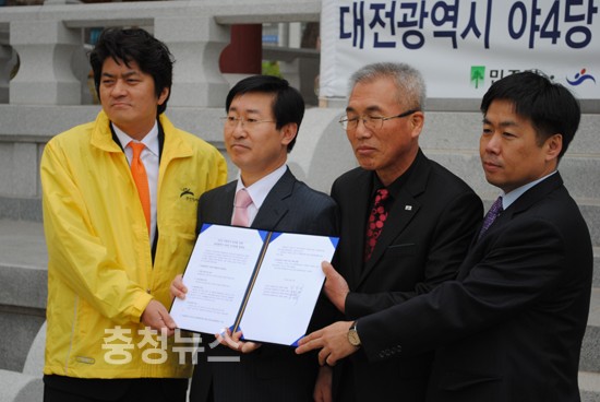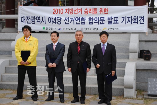 대전광역시 야4당 ( 민주당 시당, 민주노동당 시당, 창조한국당 시당, 국민참여당 시당)은 2010지방선거에서 민주주의 후퇴, 평화통일 후퇴, 민생파탄의 책임이 있는 이명박 정권을 심판하고 전시행정과 개발만능주의에 빠져있는 대전 시정을 바로잡기 위하여 다음과 같이 선거연합에 합의했다.