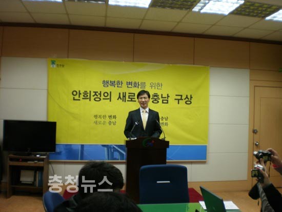 안희정 민주당 충남도지사 후보는 22일 충남도청 기자실에서 첫번째 정책 발표회를 갖고 천안함 사태로 인해 늦어진 감이 있지만 이번 6.2지선을 맞아 “사람중심의 충남 신산업발전 전략”에 대한 포부를 밝혔다.