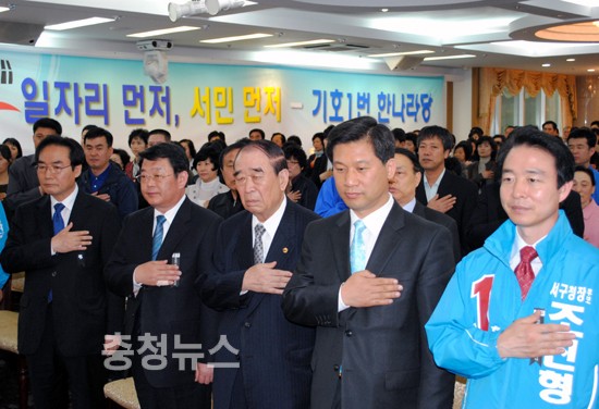이어 이번 천안함 사태나 북한의 남한재산 몰수 등 총성 없는 전쟁 중에 치러지는 이번 6.2 지방선거에서는 국론 분열도 없애고 우리 영토를 지킬 수 있는 유일한 길은 집권여당인 우리 한나라당의 승리뿐이라고 강조했다