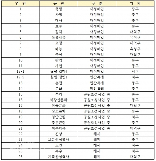 행평·사정·대사·호동·길치·복용체육·오정·매봉·목상·판암·세천·월평갈마지구 등 12개 공원은 일몰제 시행 시 난개발이 우려되는 곳으로 시는 3972억 원의 예산을 투입해 사유지 매입에 들어간 상태다.