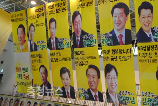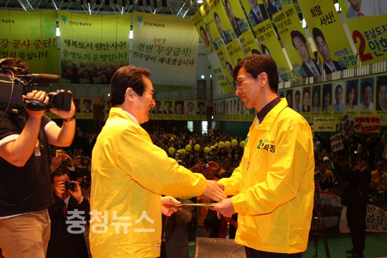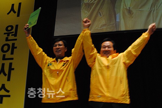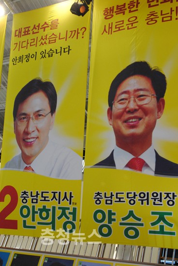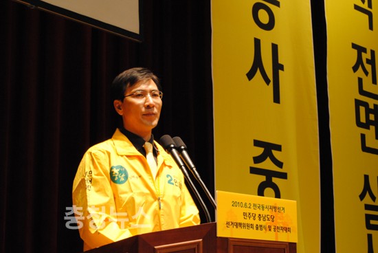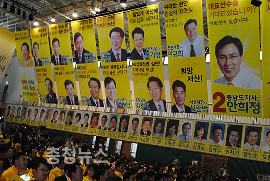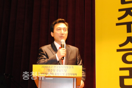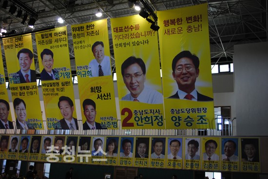 또, 양승조 충남도당위원장이 대회사, 정세균 당대표가 격려사, 안희정 충남지사 후보가 후보 수락연설을 하며 MB심판, 행복도시 원안추진, 4대강 공사 중단, 무상급식 전면실시 등의 메시지를 강조했다.
