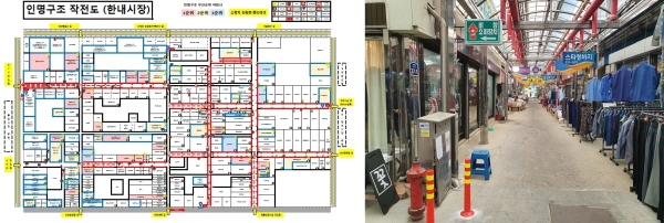 왼쪽 전통시장 '인명구조 작전도', 오른쪽 ‘눈에 띄는(호스릴) 소화전 픽토그램’