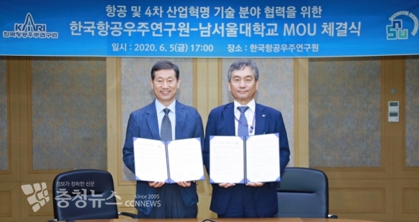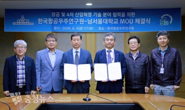 남서울대학교(총장 윤승용)는 한국항공우주연구원(원장 임철호)과 항공기술과 4차 산업혁명 기술(빅데이터, 인공지능 등) 분야에서 공동 연구 및 기술교류를 위한 업무협약을 5일 체결했다.