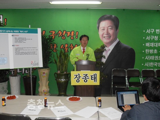 정책선거에 앞장서온 민주당 장종태 서구청장 예비후보가 “건강하고 행복한 서구”를 주제로 6일 오후 둔산동 선거사무소에서 2차 공약발표회를 열었다.