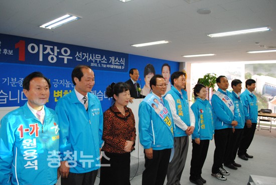 한나라당 이장우 대전 동구청장 후보가 7일 오후 5시 동구 원동 ‘바이올렛웨딩홀’ 2층 선거사무소에서 대규모 개소식을 갖고 기선잡기에 나섰다.