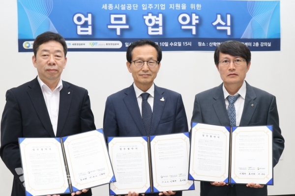 세종특별자치시시설관리공단(이사장 계용준)은 10일 산학연클러스터지원센터에서 NH농협은행 세종영업본부(본부장 이범구), 신용보증기금 충청영업본부(류재현 본부장)와 공단의 입주기업 및 소상공인 금융지원을 위한 업무협약을 체결했다.
