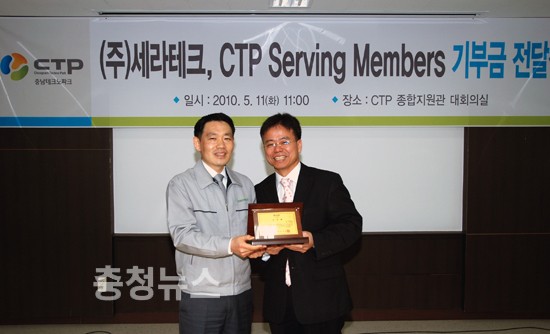 충남테크노파크(이하 CTP) 입주기업인 (주)세라테크(대표 이상규)는 지난 11일 더불어 사는 지역사회 구현하자는 뜻에서 불우이웃돕기 동참 성금 200만원 CTP에 맡겼다. 지난 2007년 CTP에 입주한 건강의료기기 제조업체인 (주)세라테크는 지난해 매출액 60억원을 달성, 올해 매출 목표 100억원 돌파한다는 계획이다.