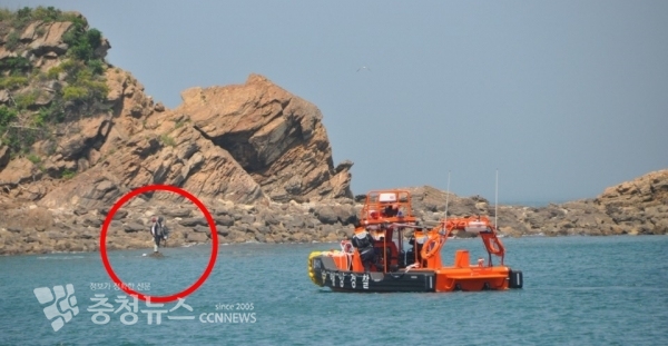 물때를 놓쳐 갯바위에 아슬하게 고립된 50 윤모씨에게 해양경찰 연안구조정이 구조를 위해 접근하고 있다. (출처=태안해양경찰서)