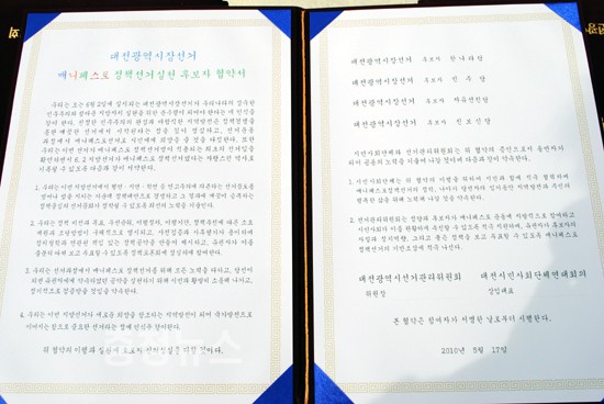 대전시 선관위 관계자는 "이번 협약을 통해 정책선거 실천유도하여 선거문화를 한 단계 도약시키는 성장동력으로 만들 것"이라고 밝혔다.
