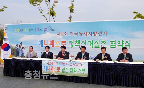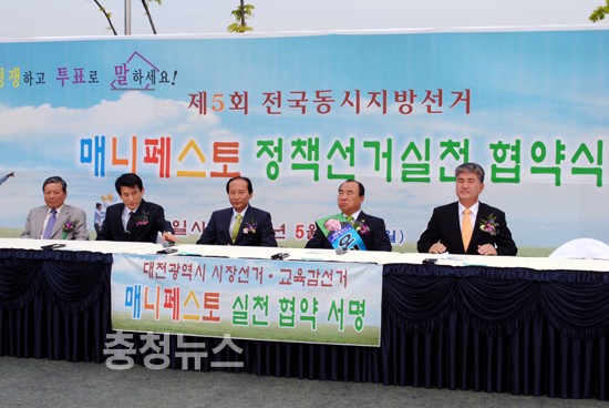 대전시 선거관리위원회는 서구 한밭수목원에서 17일 오후 6.2 지방선거에 출마하는 대전시장 및 대전교육감 후보들과 함께 '매니페스토 정책선거실천 협약식'을 개최했다.