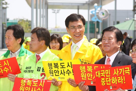 안희정 민주당 충남도지사 후보는 20일 오전 행복도시건설청에서 열린 ‘민주당 충청권 광역단체장 출정식’에 참석해 “6월2일은 잘못된 대한민국의 방향을 바로고 패륜정치를 한 이명박 대통령을 심판하는 정의로운 날이 될 것”이라며 충청인의 결의를 호소했다.