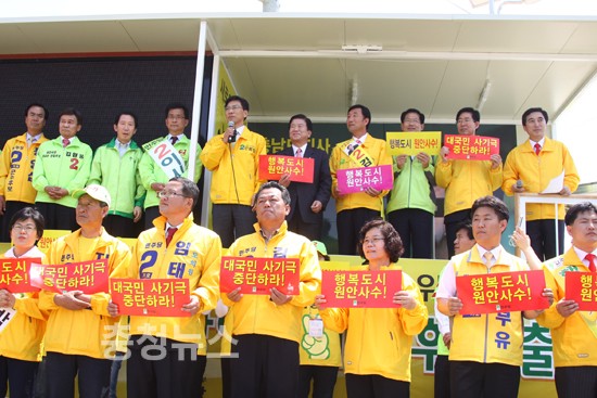 이자리에서는 김원웅, 이시종 등의 광역단체장 후보들이 결의문을 함께 낭독하며 지방선거 승리와 세종시 사수, 이명박 정권 심판의 의지를 다졌는데 김원웅 대전시장 후보는 국토균형발전의 철학을 제시한 정당이 민주당이라며 이번에 민주당원이 당선되면 세종시 수정안도 끝장날 것이라며 기세를 올렸다.