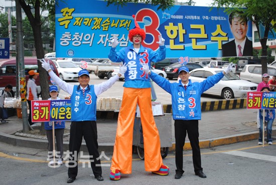 선진당 이은창 후보는 키다리 아저씨 모습으로 변장하는 퍼포먼스로 주민들에게 관심을 받고 있다