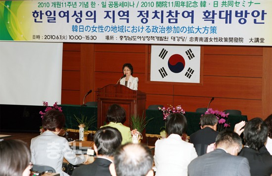 충남여성정책개발원(원장 김경숙 / 공주시 반포면 소재) 은 1일대강당에서 한‧일 여성 관련 전문가 100여명이 개원 11주년을 맞아『여성의 지역 정치참여 확대방안』이라는 주제로 세미나를 개최했다고 했다.