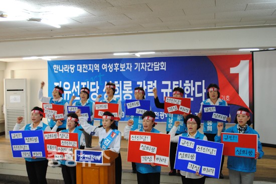 한나라당 대전시당 여성후보 일동은 1일 오전 시당사에서 자유선진당 남성 선거운동원이 한나라당 여성 선거운동원을 대로상에서 2차례나 성희롱하는 일이 발생했다며 이를 규탄하는 기자간담회를 가졌다.