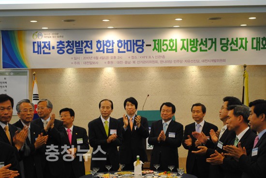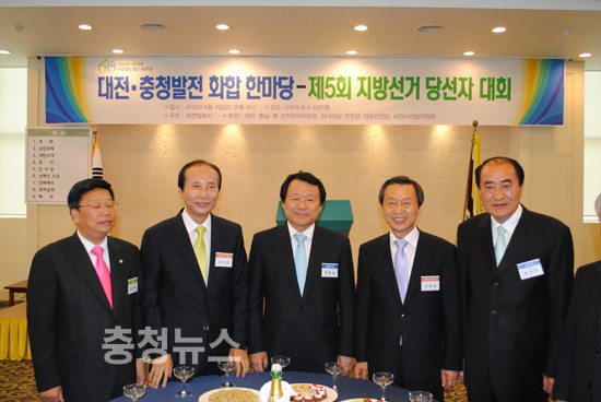 대전일보가 주최하고 대전 충남.북 선거관리 위원회, 한나라당, 민주당, 자유선진당, 대전시 개발위원회가 후원하는 대전 충청발전 화합 한마당. 제5회 지방선거 당선자 대회가 4일 오후2시 대전시 오페라 웨딩홀 신관에서 개최됐다.