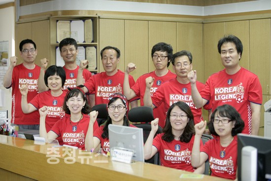 대덕구 대화동주민센터(동장 정찬용)는 2010 남아공월드컵 개막을 앞두고 대한민국 선수단의 승리와 2002 월드컵 4강 신화 재현을 기원하는 승리의 함성과 에너지가 전해질 수 있도록 9일부터 월드컵 응원 티셔츠를 착용하고 근무하고 있다고 밝혔다.
