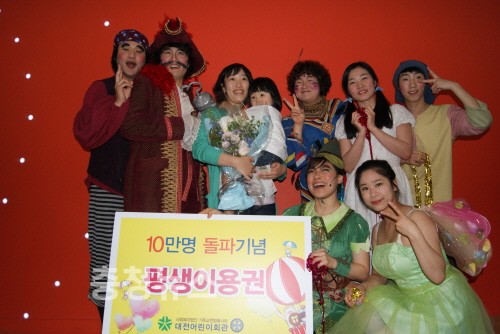 10만명째 이용고객이 되신 최혜진(33살, 대전 중구 태평동)님은 “평소 회관에서 공연하고 있는 뮤지컬이 너무 유익해서 회관을 자주 찾았다며, 뜻밖의 선물로 너무 기분 좋고, 앞으로 어린이회관의 좋은 프로그램을 홍보하겠다.”면서 소감을 밝혔다.