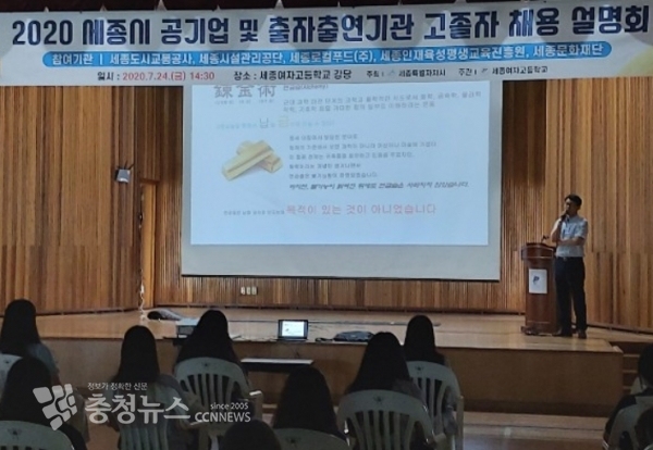 세종특별자치시(시장 이춘희)가 24일 세종여자고등학교 강당에서 진행한 ‘세종시 지방공기업 및 출자출연기관 고졸자 채용설명회’가 특성화고 졸업예정자 50여 명이 참여한 가운데 성황리에 마무리됐다.
