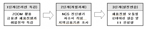 먼저 17일에는 1단계로 금융권 채용동향 및 입사전형을 이해하고 취업전략을 수립하는 5시간 과정의 온라인 특강을 진행했으며,