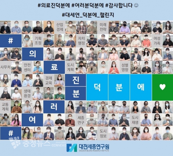 대전세종연구원(원장 박재묵)은 28일 오전 전 직원들과 함께 코로나19 대응을 위해 애쓰고 있는 의료진, 방역당국, 시민 모두에게 감사를 표하고 응원하고자 ‘#덕분에 챌린지’ 캠페인에 동참하였다.