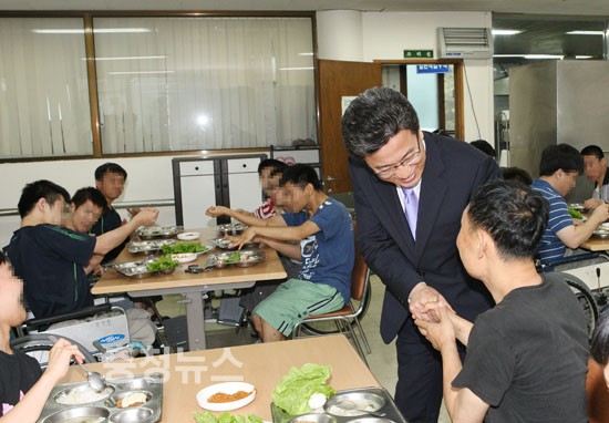 이날 오전 성재원을 찾은 허 청장은 시설 이곳 저곳을 살펴보며 자활 프로그램에 참여하는 원생들 손을 한명 한명 잡아주며 격려했다.