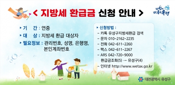 특히 유성구는 대전에서 유일하게 카카오톡으로도 환급신청이 가능해, 환급안내문을 받은 주민은 카카오톡에서 ‘유성구지방세환급’을 검색 후 안내문에 기재된 환급번호, 성명, 은행명, 계좌번호를 대화창에 입력하면 2~3일 이내에 신속하게 환급금을 받을 수 있다.