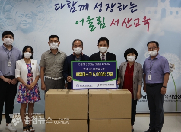 (재)서산장학재단(이사장 김태권)이 4일 서산교육청과 태안교육청에 비말마스크 10,000장을 전달하였다.