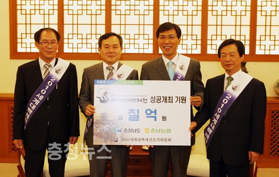 농협이 8일 2010세계대백제전의 성공개최를 기원하며 후원금 7억원을 충남도에 기탁했다.