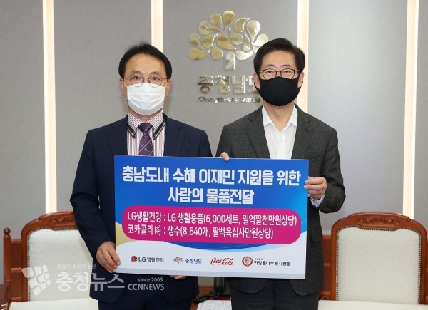 최근 폭우로 수해를 입은 이재민을 지원하기 위해 LG생활건강과 자회사인 코카콜라가 각각 생활용품과 생수를 충남도에 기부했다.
