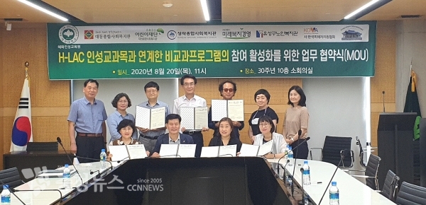 이종곤 혜화인성교육원장과 H-LAC 안광숙 학장 및 해당기관 관계자 등이 참석한 이날 협약식은 H-LAC 인성교과목과 연계한 비교과프로그램의 참여 활성화가 주목적이다.
