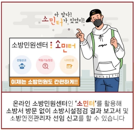 소민터에서 처리할 수 있는 민원서비스로는 △소방시설 등 작동기능점검 결과 보고서 제출 △소방안전관리자(보조자) 선임신고 △ 2·3급 소방안전 관리자 선임 연기신청 등이다.