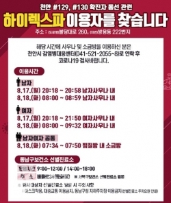 천안시청은 공식 블로그를 통해 “17일(월) 오후8시 17분 ~ 18일(화) 오전9시 32분, 해당 시간에 하이렉스파(사우나 및 소금방)를 이용하신 분은 천안시 감염병대응센터(☎041-521-2055~8)로 연락 후 코로나19 검사바랍니다”라고 전했다.