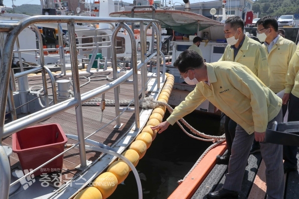 이어 양 지사는 서산 천수만으로 이동해 해상가두리 양식장을 둘러보고, 피해 예방을 위한 철저한 사전 어장 관리를 양식어가에 요청했다.