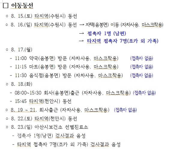 아산#36번 확진자는 음봉면 거주하는 50대로 가평 #16번 확진자의 언니(8. 23. 확진)를 16일 접촉후 17일 인후통 증상과 18일 두통, 기침, 가래, 근육통 증상으로 23일 아산시보건소 선별진료소 검체 채취후 검사결과 24일 양성판정을 받았다.