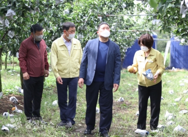 27일 의원들은 운산면 소재 사과·배 과수원을 방문해 지난 밤 태풍으로 인한 피해상황을 직접 점검하고 농민들에게 위로의 말을 건넸다.