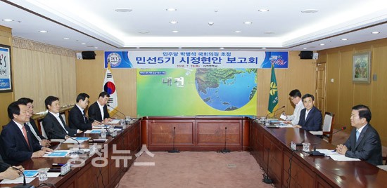 이번 보고회는 지난 15일 자유선진당 소속 지역구 국회의원(5명)을 초청하여 시정보고 한 이후, 두 번째 개최되는 보고회로 비록 당은 다르지만 지역발전을 위해 많은 관심과 도움을 주고 있는 민주당 국회의원에게 시정현안을 보고하여 지역의 어려움을 보다 정확히 파악하고 공감할 수 있는 뜻 깊은 자리로 마련했다.
