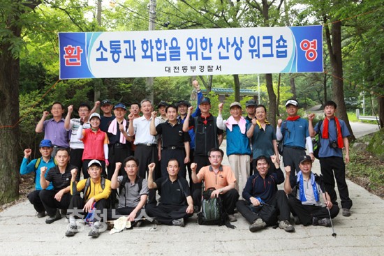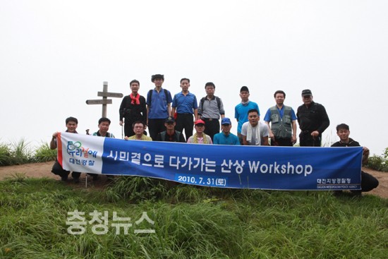 대전지방경찰청장(청장 강찬조)은 7. 31(토) ~ 8. 01(일) 이틀간 식장산에서 각 과 · 계장 등 46명과 함께 활기찬 직장문화 조성과 상하 · 동료 간 의사소통 활성화를 도모하고 정성을 다하는 국민의 경찰상을 구현하기 위해 식장산을 등반하는 「산상 워크숍」을 주재했다.