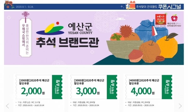 예산군은 관내에서 생산된 농·특산물을 할인 가격으로 구매할 수 있는 추석맞이 우체국 쇼핑몰 특별기획전을 개최한다고 8일 밝혔다.