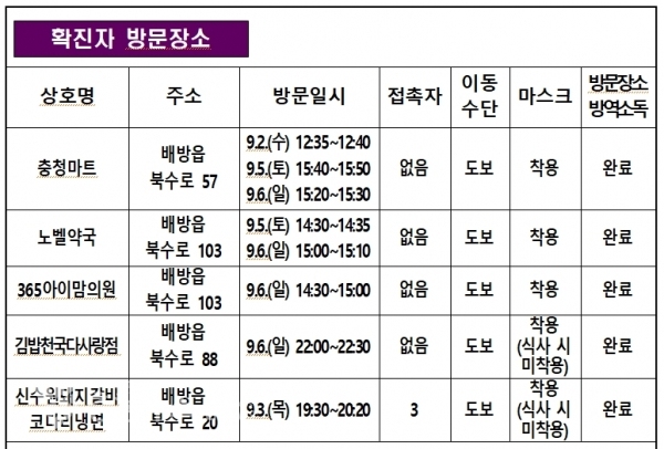 아산#47·아산#48확진자는 아산시 배뱅읍에 거주하는 50대로 31일 배방읍 사무실 방문 시 대전#297(9. 6. 확진)의 접촉자이다.