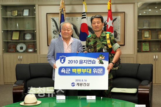 이인구 계룡건설 명예회장(6.25참전용사, 예비역 중령, 13·15대국회의원)은 16일 오후 관내 32사단을 방문해 무더위와 궂은 날씨에도 불구하고 ‘2010 을지연습’을 맞아 국가보위와 국토수호에 진력하고 있는 장병들에게 통닭 300마리를 전달하고 노고를 치하했다.