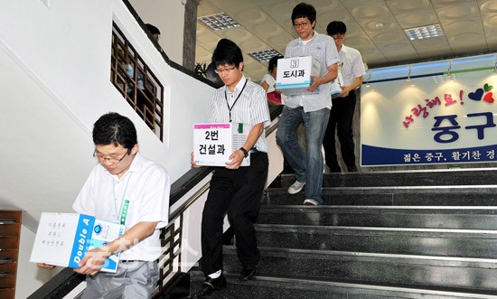 대전 중구(구청장 박용갑)는 17일 2010 을지연습 기간을 이용하여 적의 청사침입을 가상해 ‘본청 소산 및 이동훈련’을 실시했다고 밝혔다.