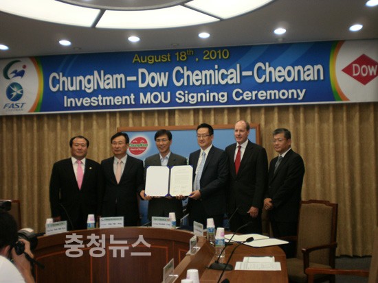 충청남도 안희정 지사와 천안시 박한규 부시장은 다우전자재료사업부의 도미니크 양(Dominic Yang) 총괄사장, 다우신소재 아태지역 대표인 브루스호크너(Mr. Bruce D. Hoechner) 사장과 18일 오전 도청 영상회의실에서 LED 및 디스플레이 핵심소재 생산공장 설립에 관한 양해각서(MOU)를 체결했다.